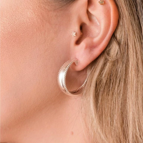 Brinco Argola Pino Contorno Pontilhado Grande no Banho Prata