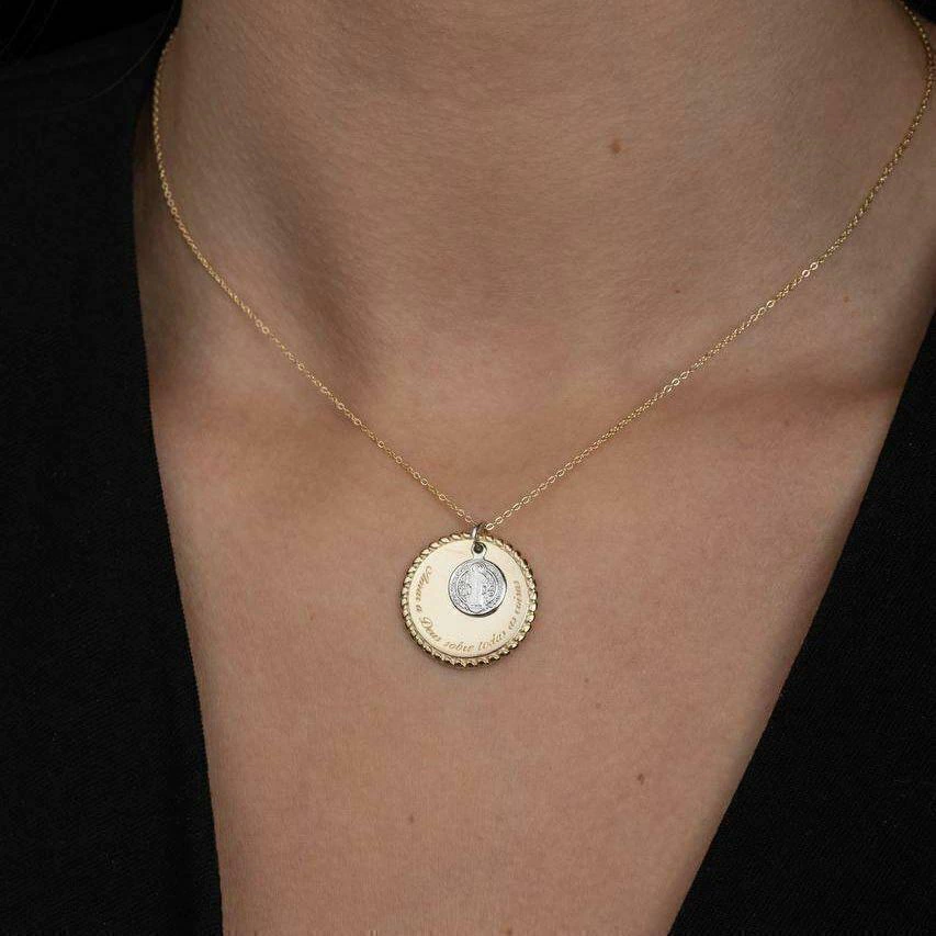 Colar Longo Medalha escrita com São Bento de 60 cm em Banho Ouro 18K