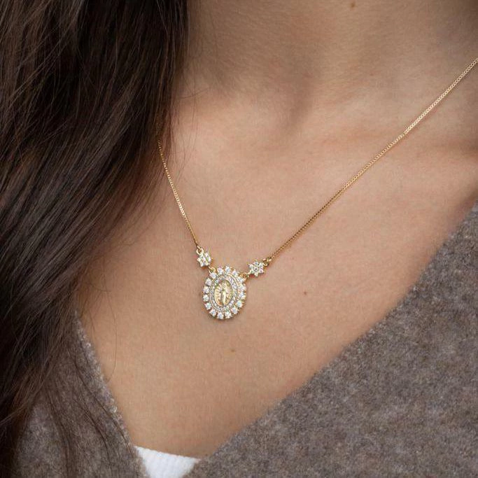 Colar Nossa Senhora das Graças com Flores de Zircônias de 45 cm + Extensor em Banho Ouro 18K