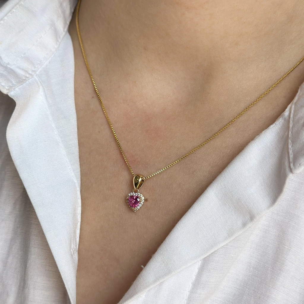 Colar Pingente de Coração Zircônias Pink em Banho Ouro 18K
