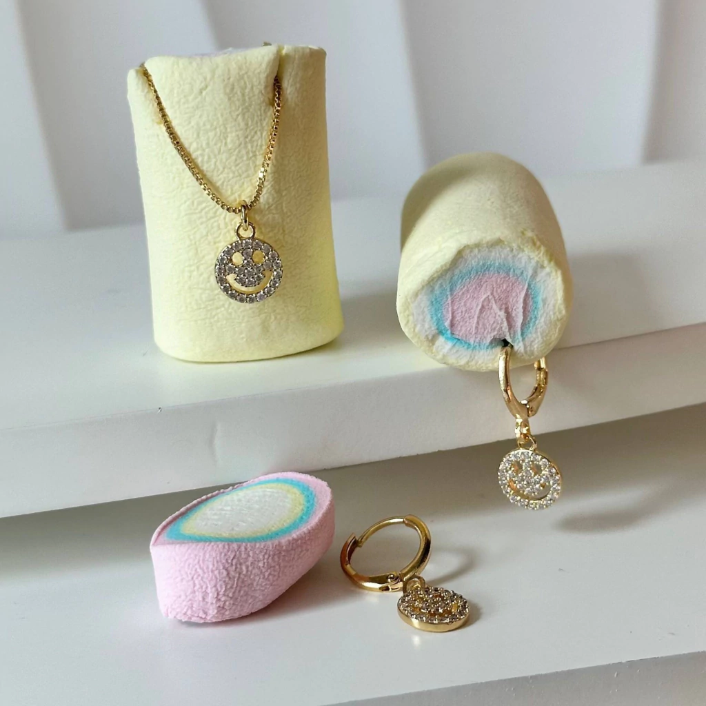 Composto por colar e brincos com o icônico símbolo do smile cravejado em zircônias, o conjunto traz brilho e uma vibe bem cool!